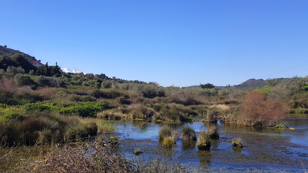 Река Алмирос, даже после осушение не потеряла свой болотистый облик. Вдоль русла тянутся заросли сочных кустарников, течение создает сложный ландшафт островков и отмелей, где гнездятся утки и цапли. Возможно, на жителя средних широт подобный пейзаж не произведет ошеломляющего впечатления, но в контексте летнего Крита — солнечного, скалистого, зеленая речная долина смотрится очень необычно. К месту, где река формирует небольшое озеро ведет широкая эвкалиптовая аллея. В жаркий летний день променад в тени раскидистых крон освежит и придаст сил, а всего через километр, вы сможете спуститься к озеру. Отсюда открывается прекрасный вид на долину реки, можно присесть на лавочку, отдохнуть и понаблюдать за уточками.